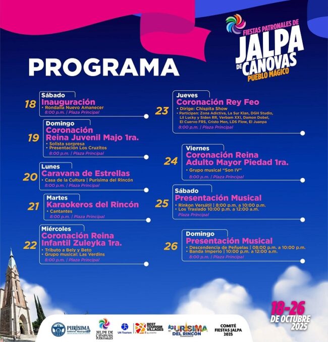 Con entusiasmo y espíritu de comunidad, iniciaron las tradicionales Fiestas de Octubre 2025 en Jalpa de Cánovas, Pueblo Mágico, en Purísima del Rincón, en un acto encabezado por el presidente municipal Roberto García Urbano, acompañado por la presidenta del DIF Municipal, Enriqueta Martínez López, integrantes del comité de fiestas, Autoridades religiosas, así como las reinas salientes y entrantes, quienes realizaron el tradicional corte de listón con el que quedaron oficialmente inauguradas estas celebraciones.