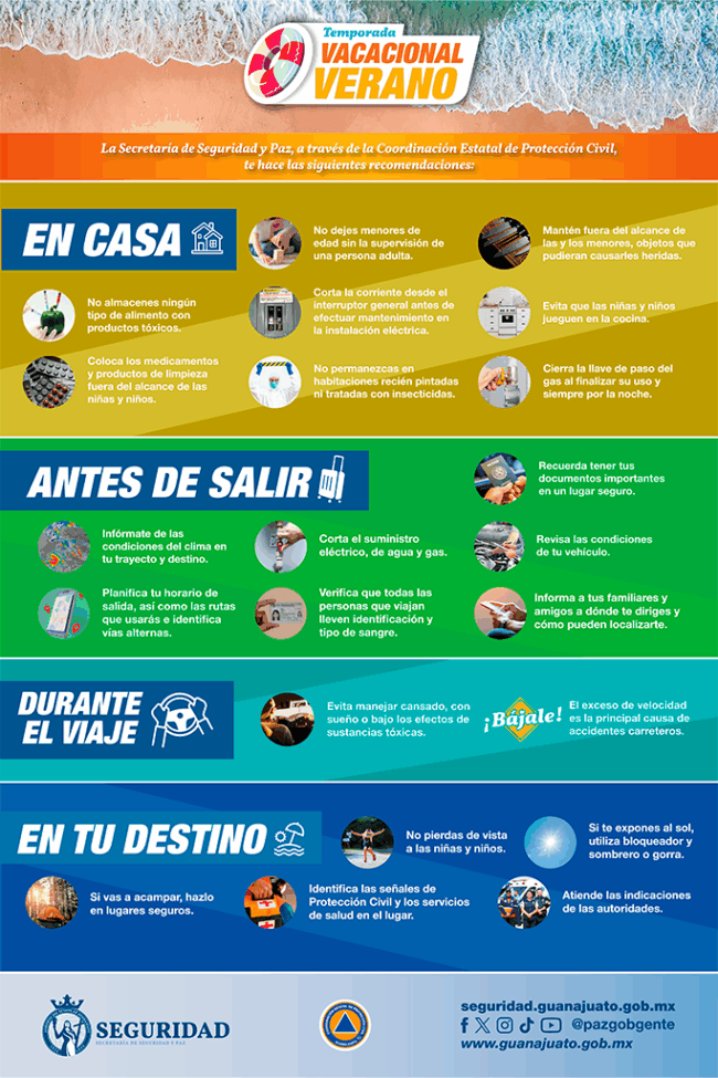 La Secretaría de Seguridad y Paz del Estado de Guanajuato comparte recomendaciones para que durante este verano las vacaciones transcurran con responsabilidad y prevención