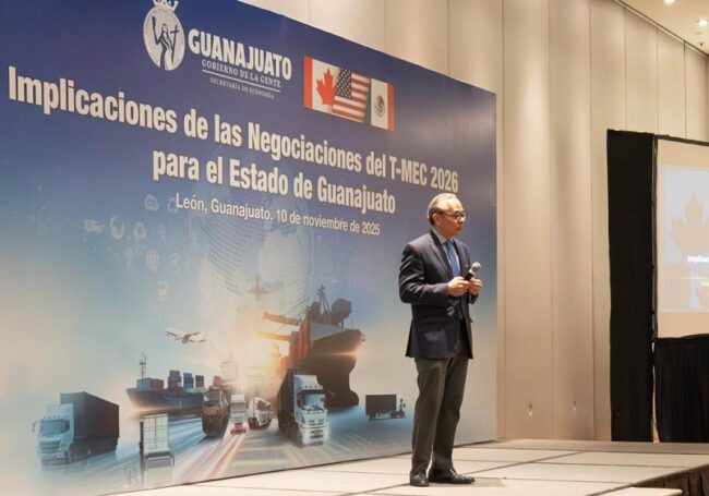 Con el fin de analizar el contexto económico nacional para fortalecer la competitividad y el atractivo del Estado frente al “Nearshoring”, se llevó a cabo la conferencia ‘Implicaciones de las Negociaciones del T-MEC 2026 para el Estado de Guanajuato’, impartida por Roberto Zapata Barradas.