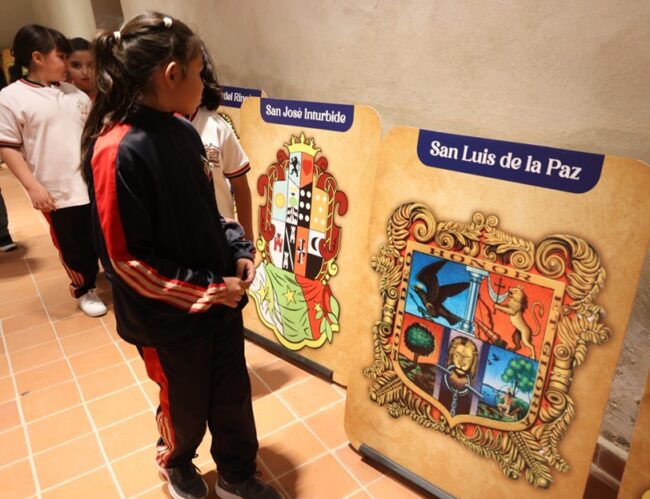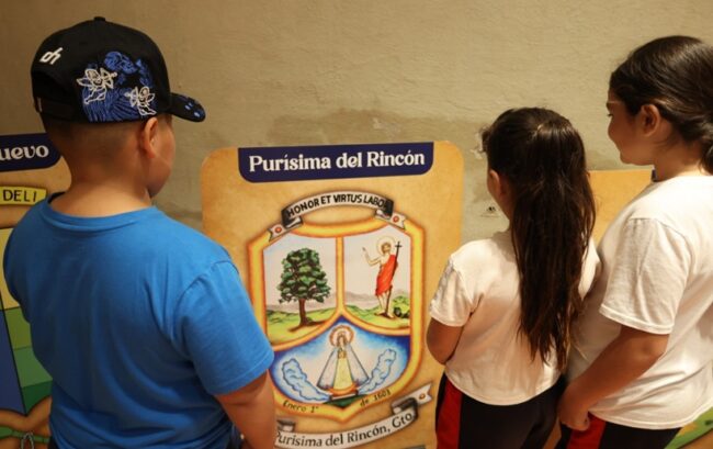 Inaugura la exposición de Escudos Oficiales de los 46 municipios de Guanajuato y en la primera visita estudiantes de primaria repasan la historia