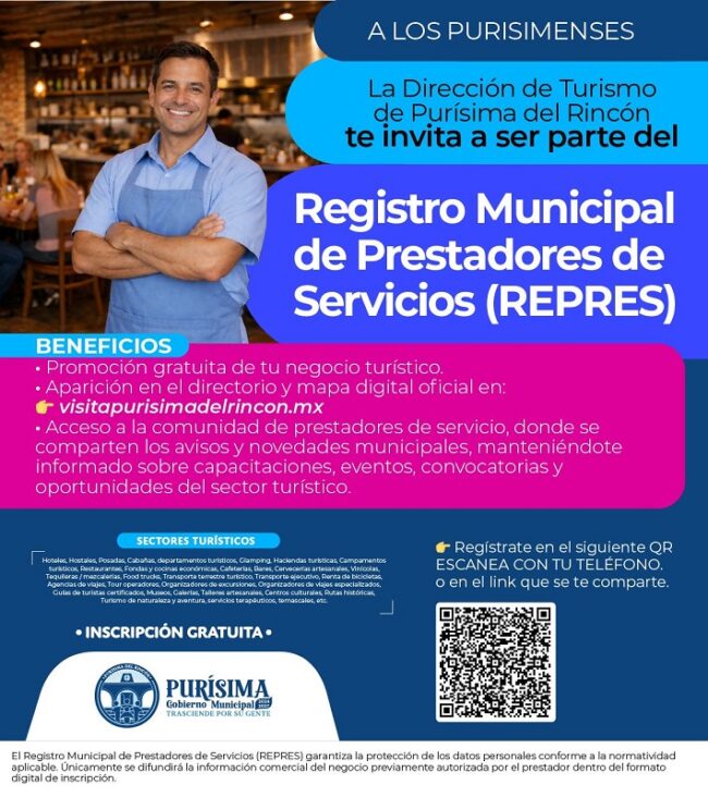 La inscripción al REPRES es totalmente gratuita y brinda a los prestadores de servicios promoción sin costo en la página oficial de turismo visitapurisimadelrincon.mx, dentro de un mapa digital donde turistas y visitantes podrán conocer y ubicar fácilmente los servicios disponibles en el municipio.