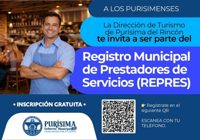 Purísima del Rincón lanza un nuevo programa con el Registro Municipal de Prestadores de Servicios (REPRES) es un programa permanente realizado por la Dirección de Turismo, por encargo del presidente municipal Roberto García Urbano, con el objetivo de impulsar a los prestadores de servicios turísticos del municipio y fortalecer el crecimiento del sector en Purísima del Rincón.